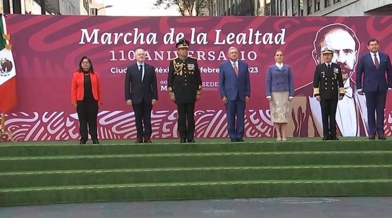En un templete con la leyenda Marcha de la Lealtad, otros miembros del gabinete e invitados presenciaron la escenificación de este evento.