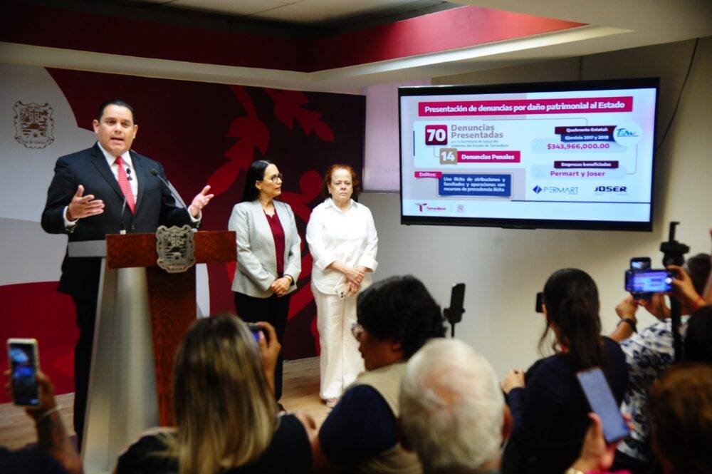 Junto al secretario de Salud, Vicente Joel Hernández Navarro; la secretaria Anticorrupción y Buen Gobierno, Norma Angélica Pedraza Melo, y la secretaria de Administración, Luisa Eugenia Manautou Galván, detalló que las denuncias fueron presentadas ante el Congreso del Estado, la Auditoría Superior del Estado, la Auditoría Superior de la Federación y la Secretaría de Anticorrupción y Buen Gobierno de Tamaulipas, y que los ilícitos detectados incluyen el uso indebido de atribuciones y facultades, así como operaciones con recursos de procedencia ilícita.