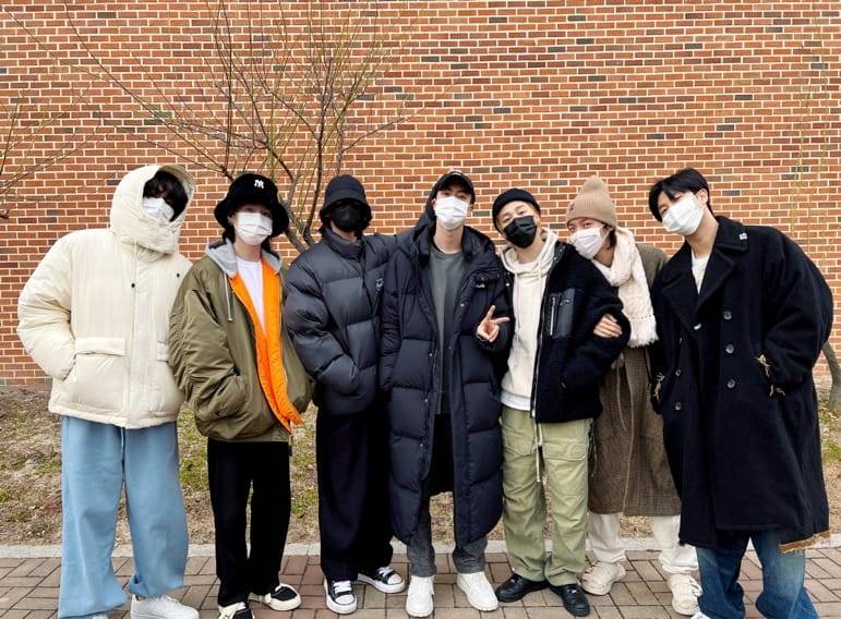 Todos los miembros se unieron dulcemente a Jin en su camino para alistarse, posando cariñosamente para una foto con su nuevo corte de pelo rapado. Escribieron: “¡¡Nuestro hyung!! Vuelve sano y salvo!! Te queremos”.