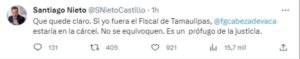 Mediante su cuenta personal de X, antes Twitter, Santiago Nieto aseguró que la información obtenida por la defensa de Cabeza de Vaca “proviene de un funcionario contratado por honorarios, cuyo máximo cargo fue el de subdirector de área”.
