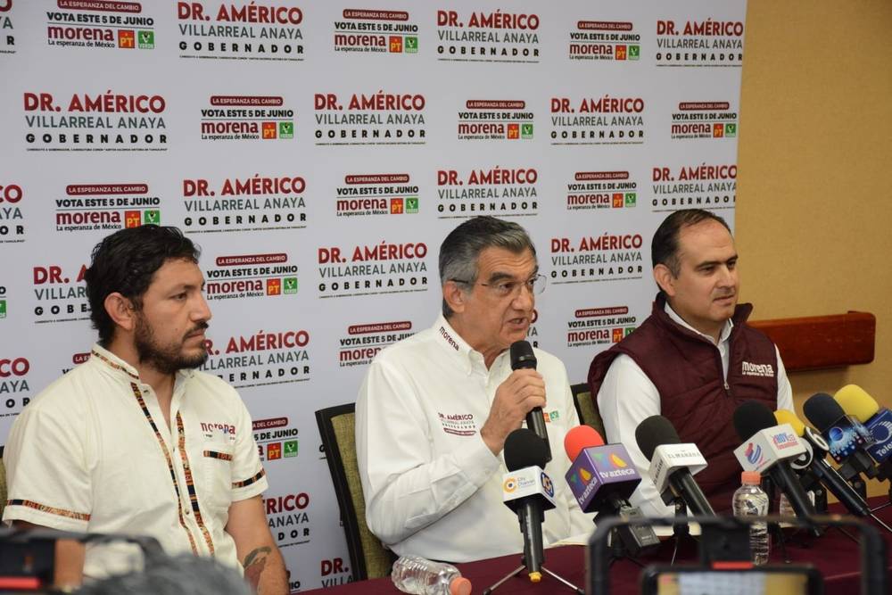 Américo Villarreal, con la presencia del Delegado Ernesto Palacios y del Secretario de comunicación del CEN de MORENA, Diego Hernández, reprobaron la estrategia panista y del gobierno de Tamaulipas de organizar bingos y otras actividades para limitar la asistencia a actos de campaña de Morena, por lo que habrán de presentar la queja correspondiente ante la instancia electoral.