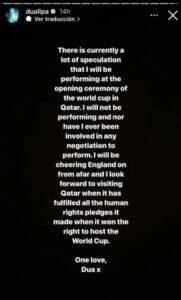 Se trata de la cantante Dua Lipa, quien a través de sus redes sociales desmintió que estará presente en la ceremonia de inicio de la Copa del Mundo, donde también aprovechó para mandar un mensaje contundente al país anfitrión por sus escándalos contra los derechos humanos.
