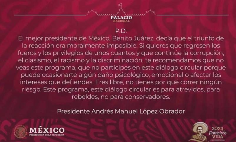“El mejor presidente de México, Benito Juárez, decía que el triunfo de la reacción era moralmente imposible. Si quieres que regresen los fueros y los privilegios de unos cuantos, que continúe la corrupción, el clasismo, el racismo, la discriminación, te recomendamos que no veas este programa, que no participes en este diálogo circular porque puede causarte algún daño psicológico, emocional o afectar los intereses que defiendes.