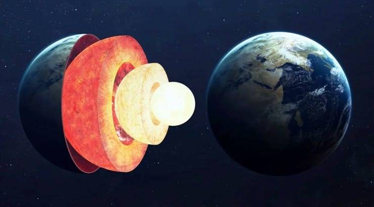 La Tierra está formada por la corteza, el manto y los núcleos interno y externo. El núcleo interno sólido está situado a unos 5.000 kilómetros por debajo de la corteza terrestre y está separado del manto semisólido por el núcleo externo líquido, lo que permite que el núcleo interno gire a una velocidad distinta de la rotación de la propia Tierra.
