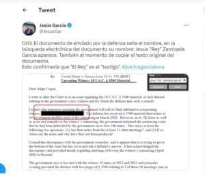 El periodista Arturo Ángel, quien cubre el caso desde Nueva York también confirmó a El Rey como testigo en el juicio contra García Luna a través de su cuenta de Twitter. Por su parte el comunicador Jesús García compartió a través de sus redes sociales una imagen de un procesador de textos en la que, en el documento dirigido al juez Brian Cogan, se puede ver que el programa de computo encuentra el nombre de El Rey Zambada.