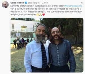 “Lamento profúndame el fallecimiento del primer actor #fernandobecerril con el que tuve el honor de trabajar en varios proyectos de teatro cine y televisión, GRAN maestro y amigo!.. Mis condolencias a sus familiares y amigos, descanse en paz”, se lee en el perfil de Twitter de Ripoll.