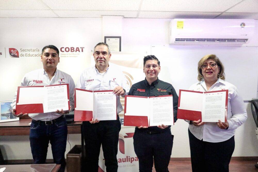 El documento fue signado por Víctor Manuel González Salum, director general del COBAT, Oscar Azael Rodríguez Perales titular del INJUVE, y como testigos, José Fernando Huerta Palomo del Instituto y Dora Isabel Flores Becerra por parte del colegio.