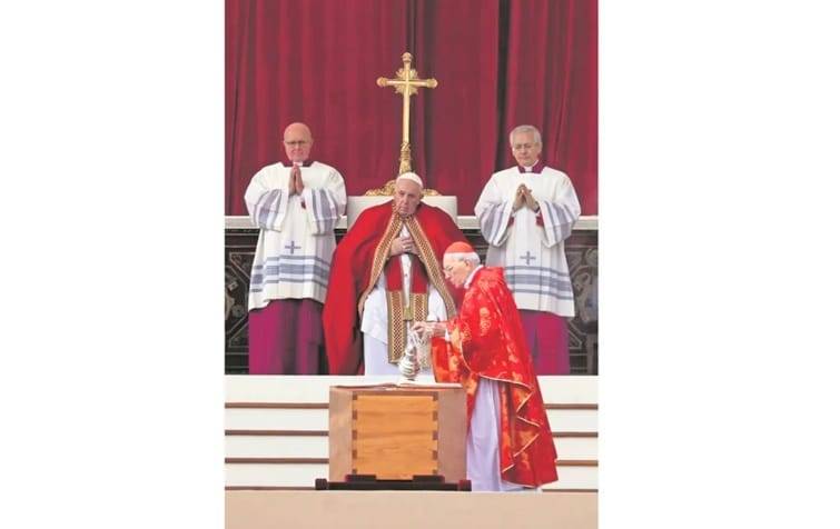 Las campanas repicaron y la multitud aplaudió cuando los portadores del féretro salieron de una Basílica de San Pedro envuelta en niebla y colocaron el sencillo ataúd de ciprés de Benedicto XVI ante el altar en la plaza exterior. Portando las vestimentas carmesí típicas de los funerales papales, Francisco abrió el servicio con una oración y lo cerró bendiciendo solemnemente el ataúd e inclinando la cabeza.