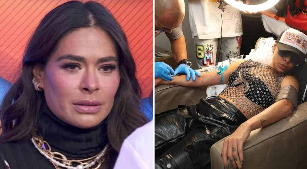 En la imagen aparece Galilea Montijo recostada en un sillón con un baumanómetro (artefacto que sirve para medir la presión arterial) en un brazo y una liga en el otro, mientras que un médico le suministra un medicamento vía intravenosa.