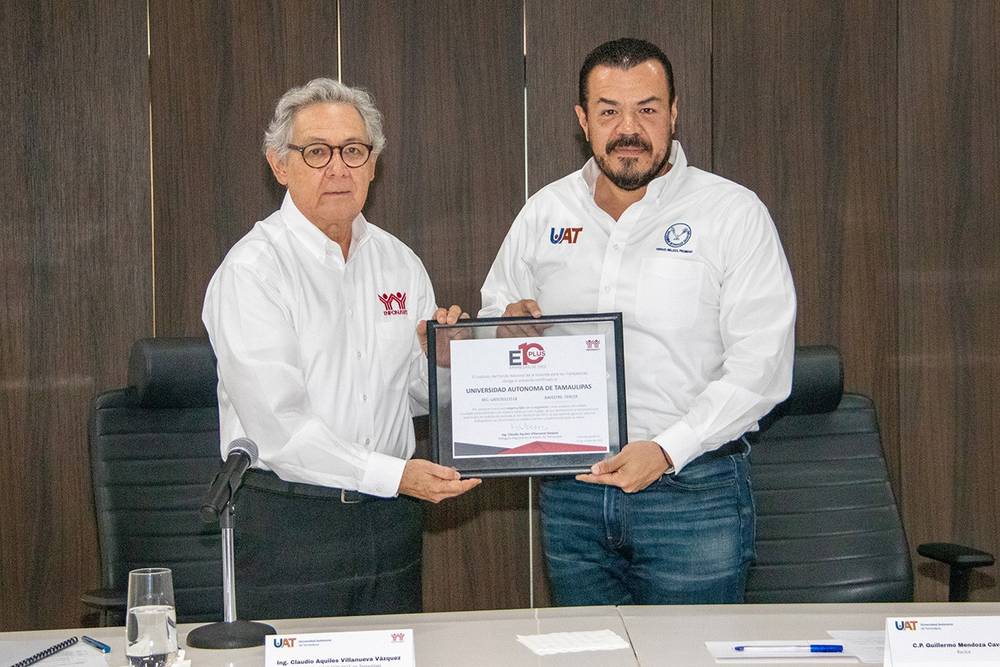 La Universidad Autónoma de Tamaulipas (UAT) recibió el reconocimiento “Empresa de Diez Plus” del Instituto del Fondo Nacional de la Vivienda para los Trabajadores (INFONAVIT), por cumplir en tiempo y forma con sus obligaciones fiscales en materia de vivienda.