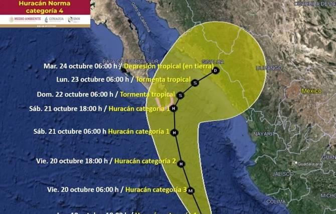 Varios estados de esta región de México ya comenzaron a sentir efectos de este ciclón, y se prevé que toque tierra en el estado de Baja California Sur el sábado por la tarde. Para entonces, aunque la intensidad de Norma ya sería más baja, llegaría a tierra como huracán categoría 1.